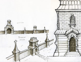 The gate and walls can surround this institutional-esqe edifice. It is based on plans from the original Faygo factory located on the banks of the Detroit River.